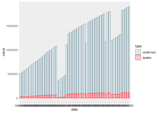library(betterCallSal) # Wrong format period = c("5-6-2020","7-8-2020") country = "US" plot <- betterCallSal::drawCovidPlot(period,country) #> #> Attaching package: 'dplyr' #> The following objects are masked from 'package:stats': #> #> filter, lag #> The following objects are masked from 'package:base': #> #> intersect, setdiff, setequal, union #> -- Attaching packages -------------------- tidyverse 1.3.0 -- #> v ggplot2 3.3.2 v purrr 0.3.4 #> v tibble 3.0.3 v stringr 1.4.0 #> v tidyr 1.1.2 v forcats 0.5.0 #> v readr 1.4.0 #> Warning: package 'ggplot2' was built under R version 4.0.3 #> Warning: package 'readr' was built under R version 4.0.3 #> -- Conflicts ----------------------- tidyverse_conflicts() -- #> x dplyr::filter() masks stats::filter() #> x dplyr::lag() masks stats::lag() #> Warning: package 'reshape' was built under R version 4.0.3 #> #> Attaching package: 'reshape' #> The following objects are masked from 'package:tidyr': #> #> expand, smiths #> The following object is masked from 'package:dplyr': #> #> rename #> Warning: `summarise_each_()` is deprecated as of dplyr 0.7.0. #> Please use `across()` instead. #> This warning is displayed once every 8 hours. #> Call `lifecycle::last_warnings()` to see where this warning was generated. #### # You Got error because your date format is not Correct # Correct format period = c("05-06-2020","07-08-2020") country = "US" plot <- betterCallSal::drawCovidPlot(period,country)
