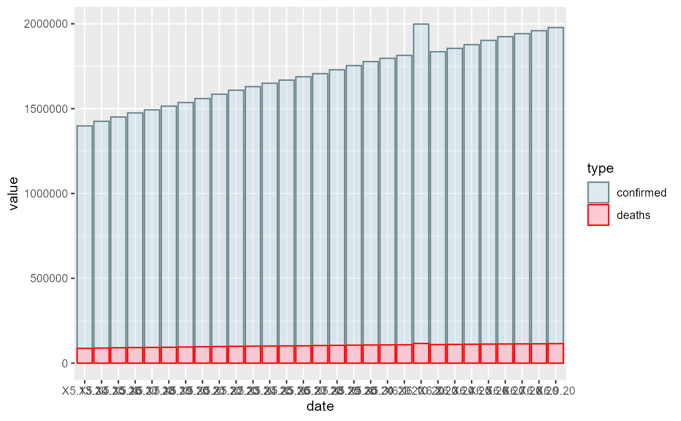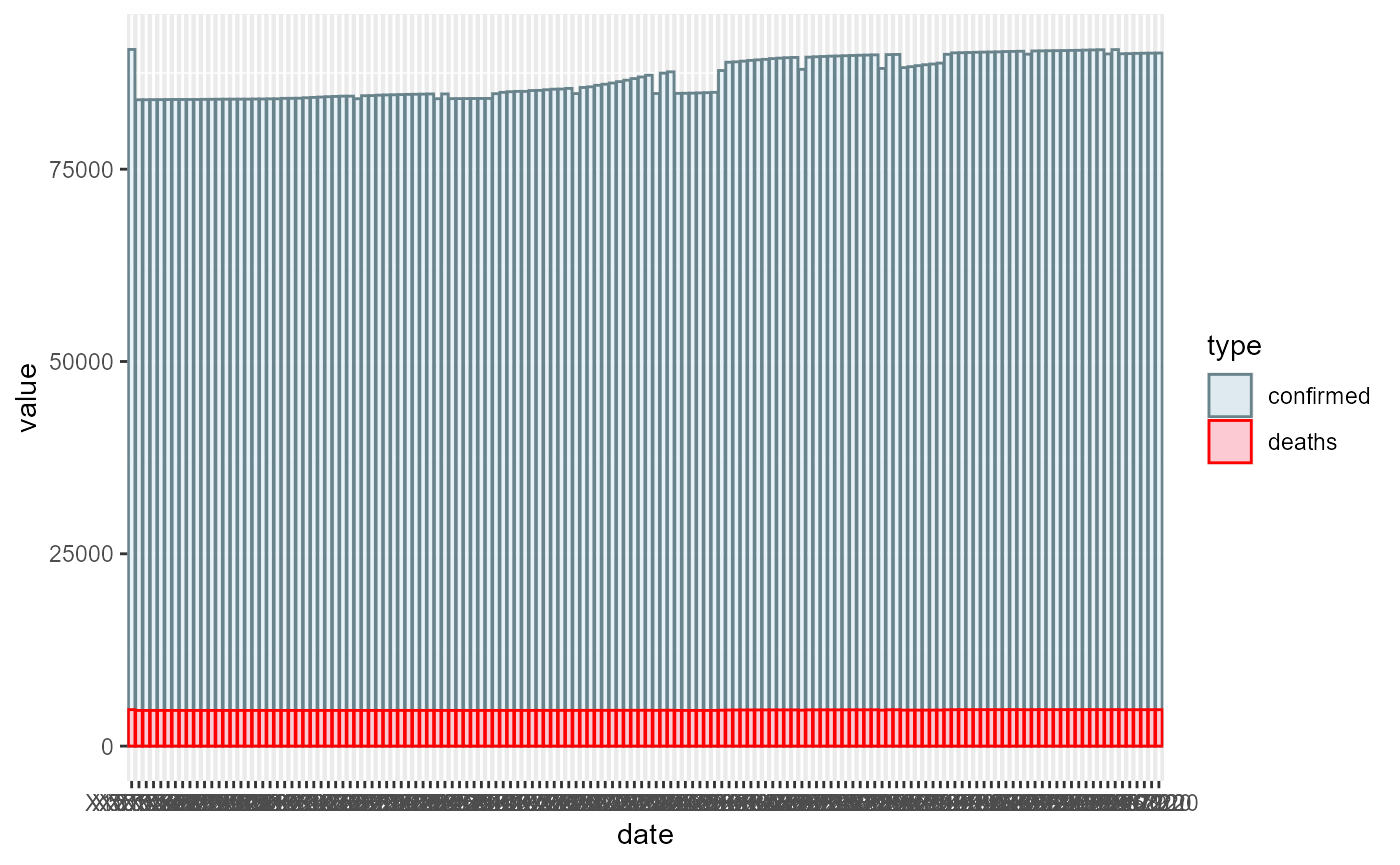 ## Want to draw the plot of the number of covid-19 deaths and confirmed cases during a time series in a specific country? ## Use “drawCovidPlot” function ### How to use it: ###### This function gets a vector containing the start and end date of the time series and the name of a specific country as input and throws a ggplot barplot which it’s y-axis is the number of deaths and confirmed cases in that especific country. ###### The date format is like that: “mm-dd-yy” and the format of type should be either “Deaths” or “Confirmed”. ###### Again don’t forget that you should’t pass dates when Covid-19 hadn’t appeared yet ###### An example: